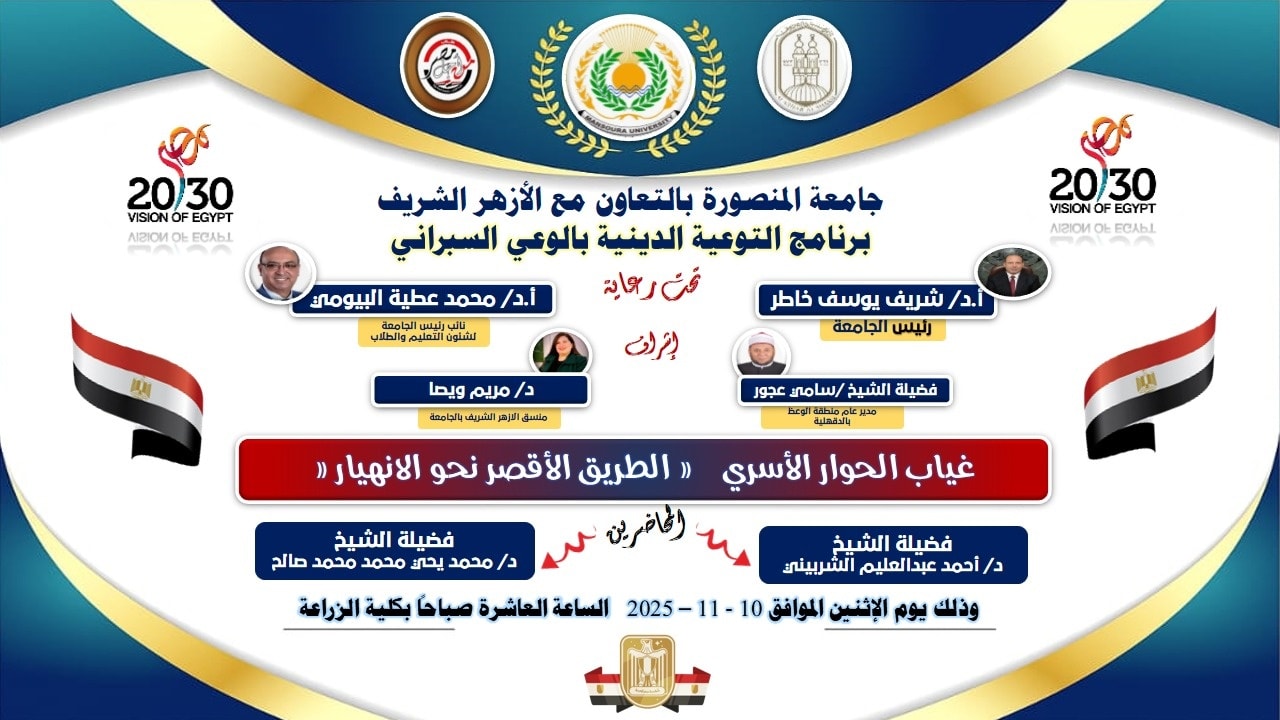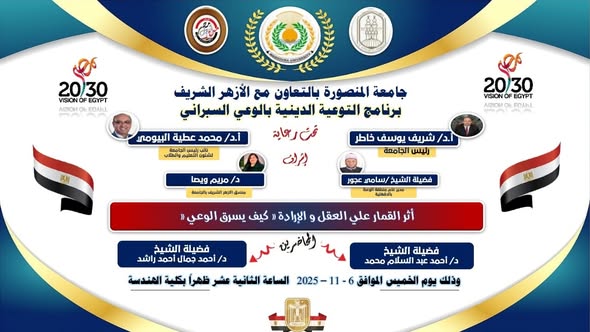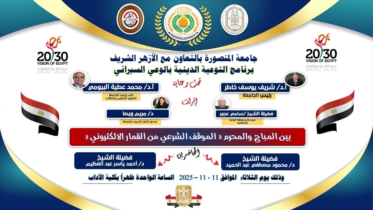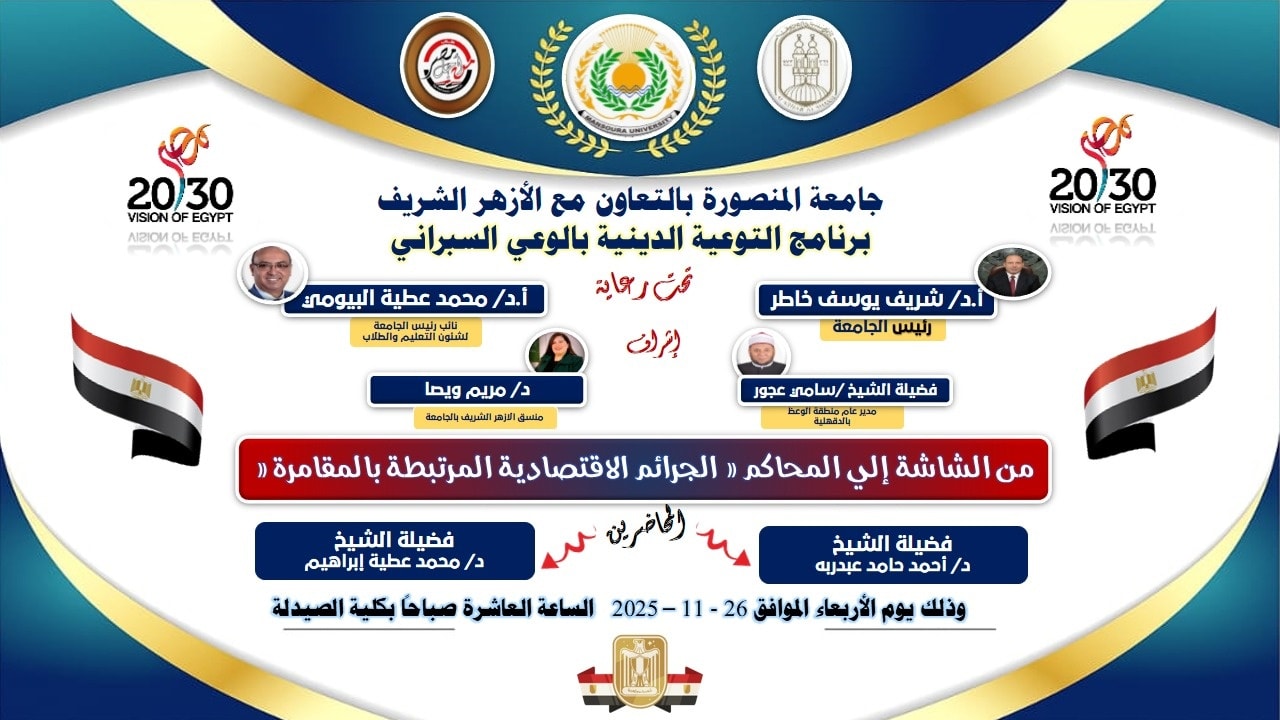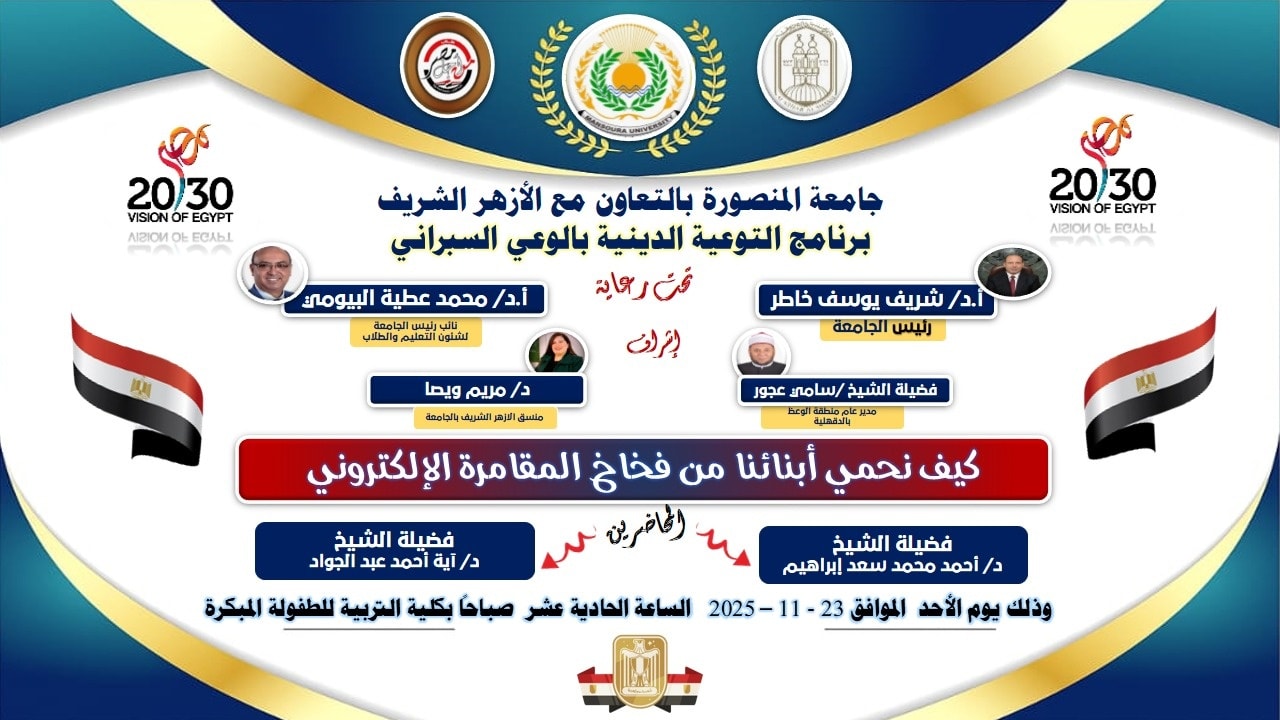 تحت رعاية معالي الأستاذ الدكتور شريف يوسف خاطر رئيس جامعة المنصورة، ومعالي الأستاذ الدكتور محمد عطية البيومي نائب رئيس الجامعة لشئون التعليم والطلاب، وبالتعاون مع فضيلة الشيخ سامي عجور مدير عام منطقة الوعظ بالأزهر الشريف بالدقهلية، وبإشراف السيدة الدكتورة مريم ويصا منسق الأزهر الشريف ونائب منسق الأنشطة الطلابية بالجامعة، تواصل الجامعة تنفيذ فعاليات برنامجها التوعوي الخاص بالأمن السيبراني للعام الجامعي 2025/2026.