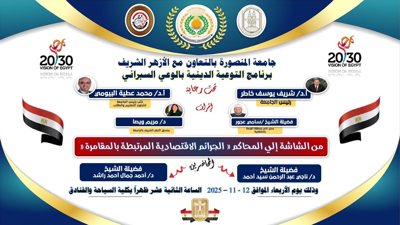 جامعة المنصورة تواصل فعاليات البرنامج التوعوي للأمن السيبراني بالتعاون مع منطقة وعظ الدقهلية محاضرات تثقيفية حول مخاطر "القمار الإلكتروني" وتأثيره على الشباب والمجتمع