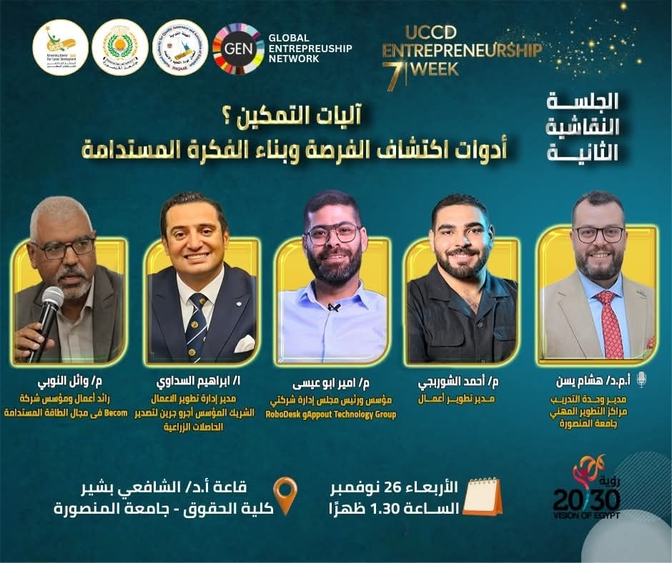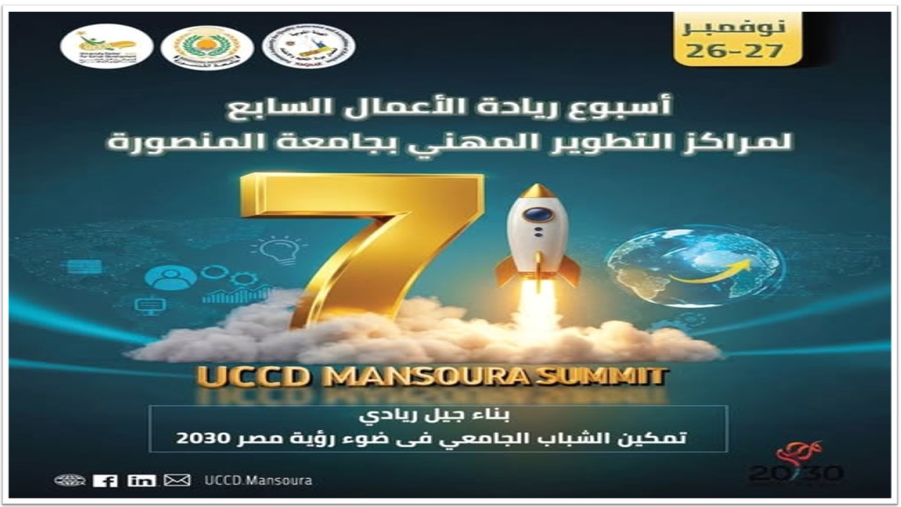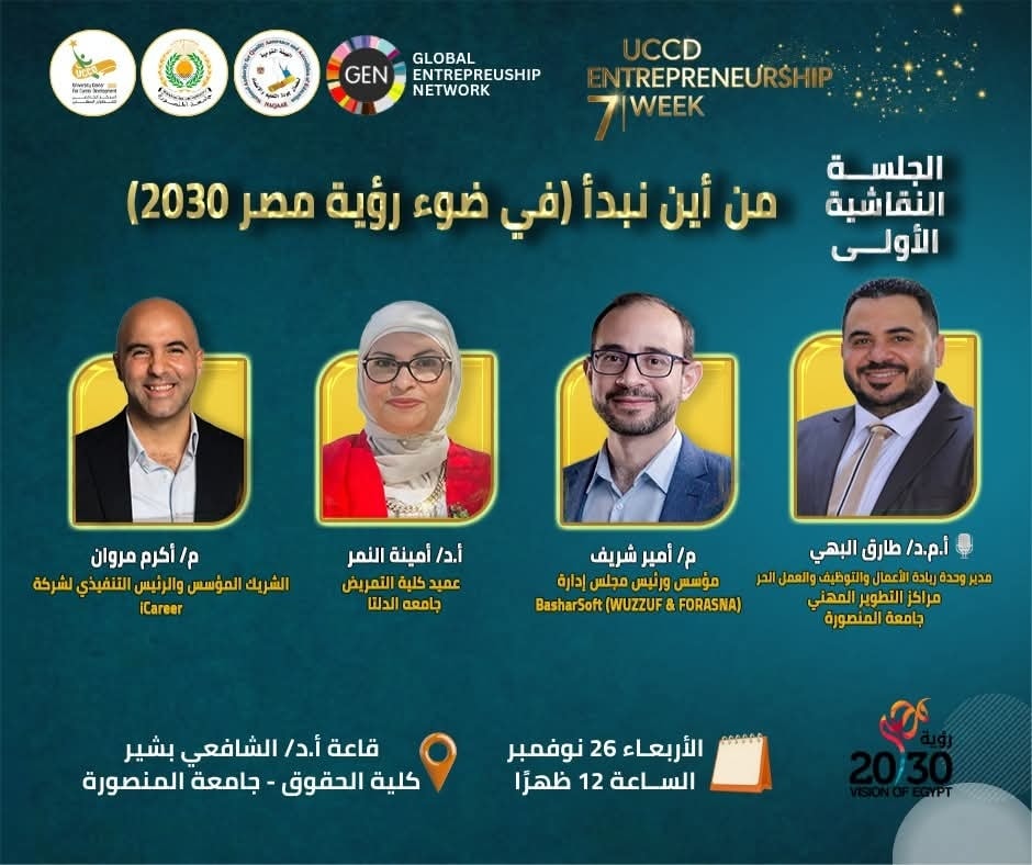 تحت شعار "بناء جيل ريادي تمكين الشباب الجامعي في ضوء رؤية مصر 2030" تستعد مراكز التطوير المهني بجامعة المنصورة لاستضافة الحدث السنوي الأهم، وهو أسبوع ريادة الأعمال السابع، وذلك يومي 26 و 27 نوفمبـــــــر 2025.